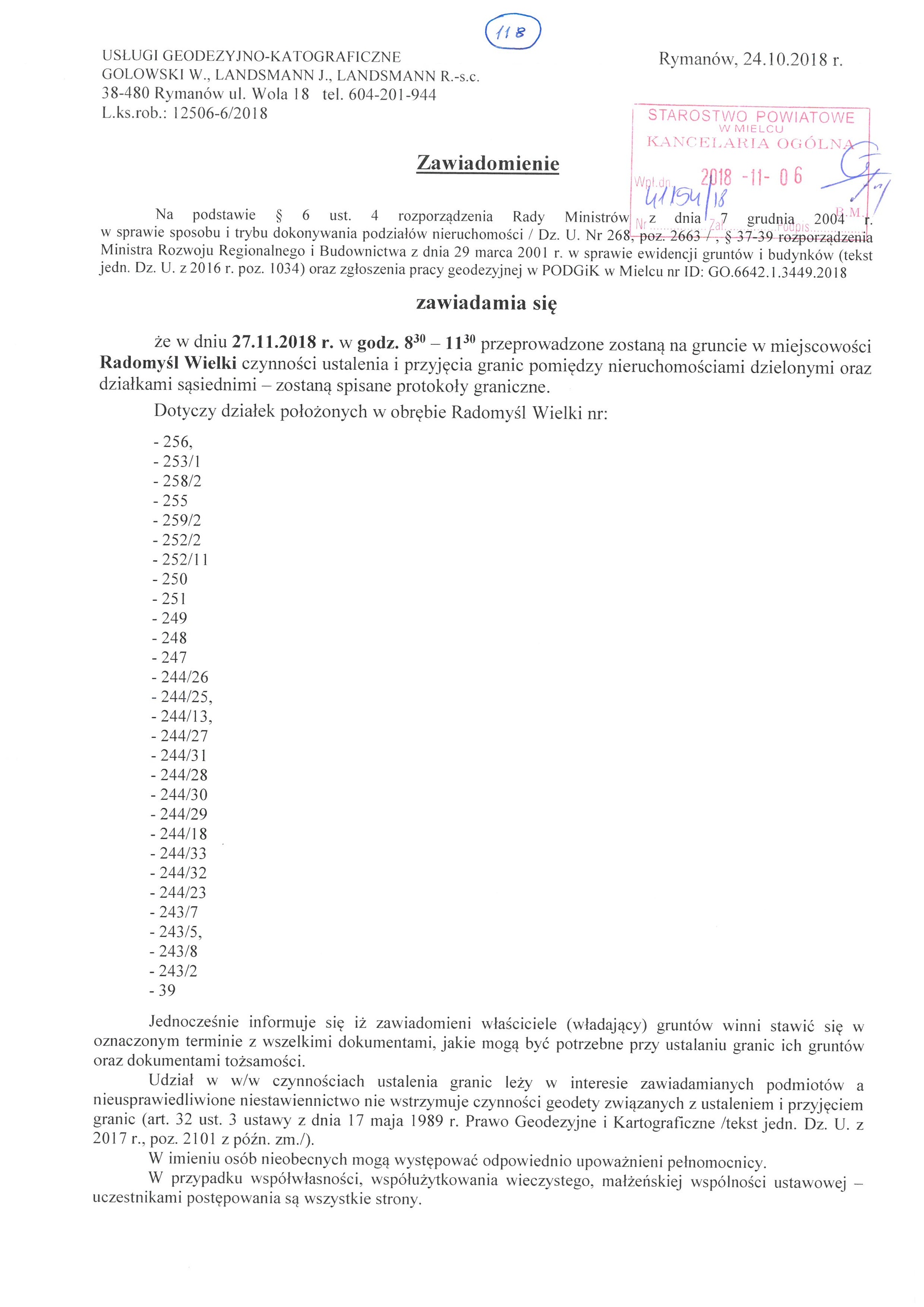 W dniu 27.11.2018 roku w godz. 8:30 - 11:30 przeprowadzone zostaną na gruncie miejscowości Radomyśl Wielki czynności ustalenia granic pomiędzy nieruchomościami dzielonymi oraz działkami sąsiednimi.
